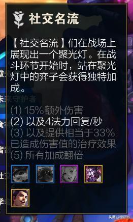 社交名流。在s6.5赛季当中,这个羁绊做出了一些调整,削弱了一级社交名流的伤害加成效果,但是对两级和三级的社交名流没有任何影响,而且在这个基础上增加了五级社交名流羁绊的效果,就是将伤害加成、法力值回复、全能吸血的效果整体翻倍,也就是说现在作为社交名流的主C将会特别的幸福,可以享受到更加美好的待遇,轻轻松松即可输出爆表,相信在这个新赛季当中,很快就会出现各种名流大C满天飞的情况了。