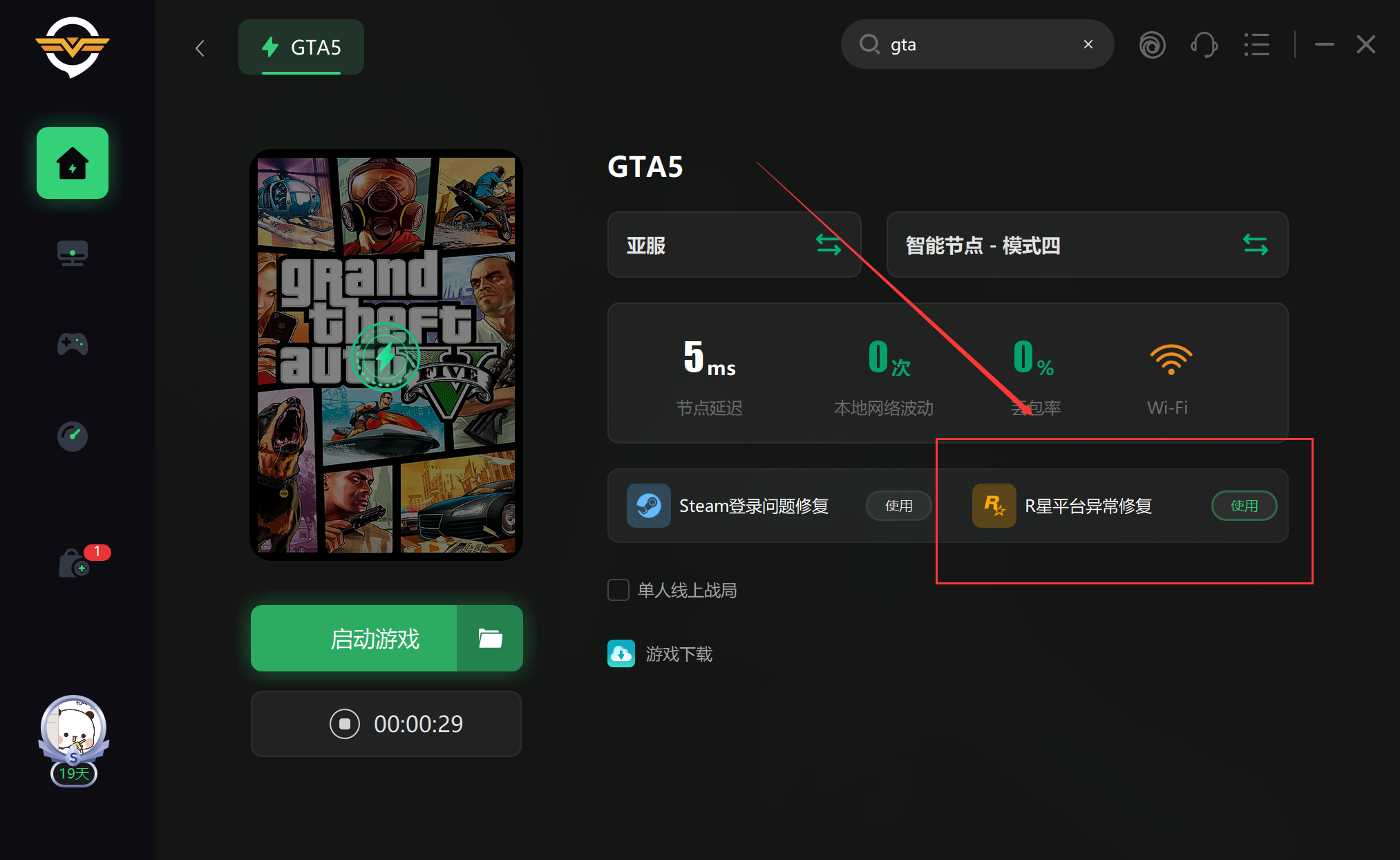 在奇游的加速页面中,玩家们还可以看到专为R星异常网络问题而推出的修复工具,使用起来很简单,玩家们也可以试试先修复,再保持加速进入R星,基本上都能解决连不上服务器的问题。