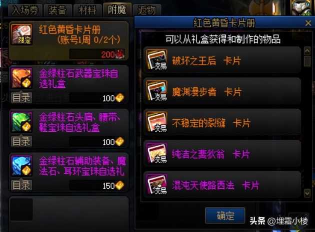 也可以在琳赛·罗森、梅丽处兑换红色黄昏卡片册,在库里欧处兑换暗黑之眼卡片册,有一定几率获取上述卡片。