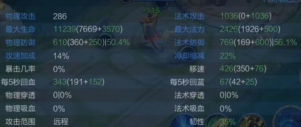 这是神装后的面板,法强超过了1000,物抗不算高,但法强非常可观,血量1.1万也不算低,后期换半肉以下的英雄还是很稳的,大招转数快,回血效果很好。