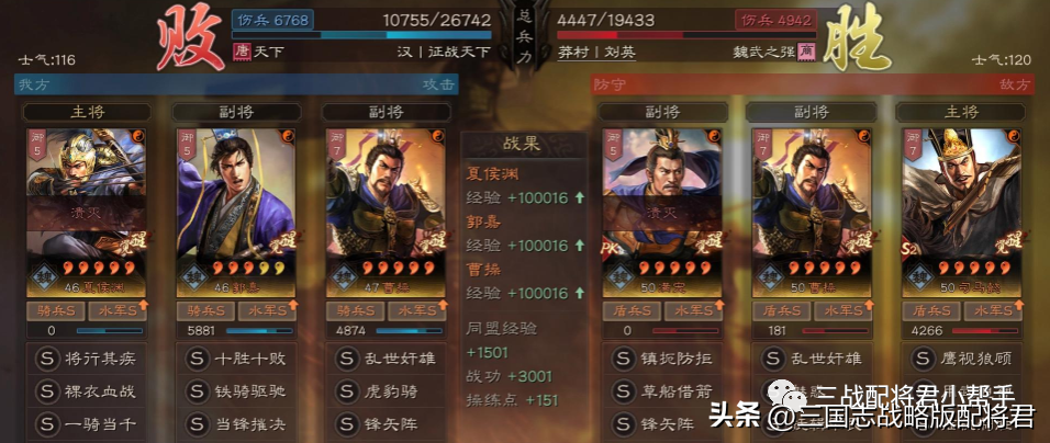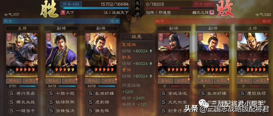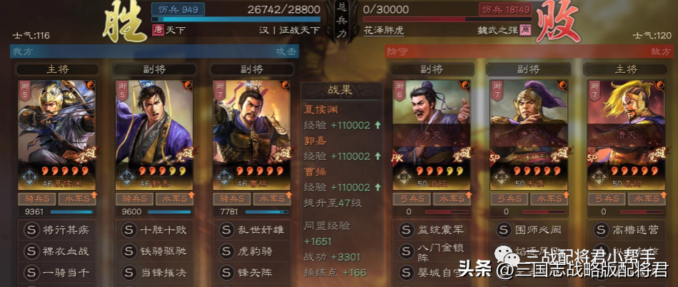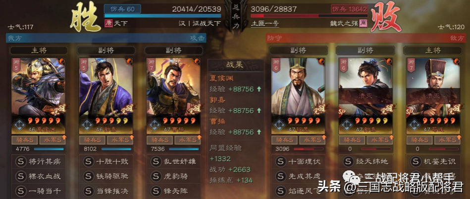 总结:渊骑这套阵容只要不碰到箕形阵青州枪,在和其他队伍的对抗的角度来说,基本上优势的对局是更多的,尤其是太尉盾这种队伍,来的越多打的越欢!很多时候也会出现几千残兵反杀对手两万多兵力的对局,这个是最舒服的!