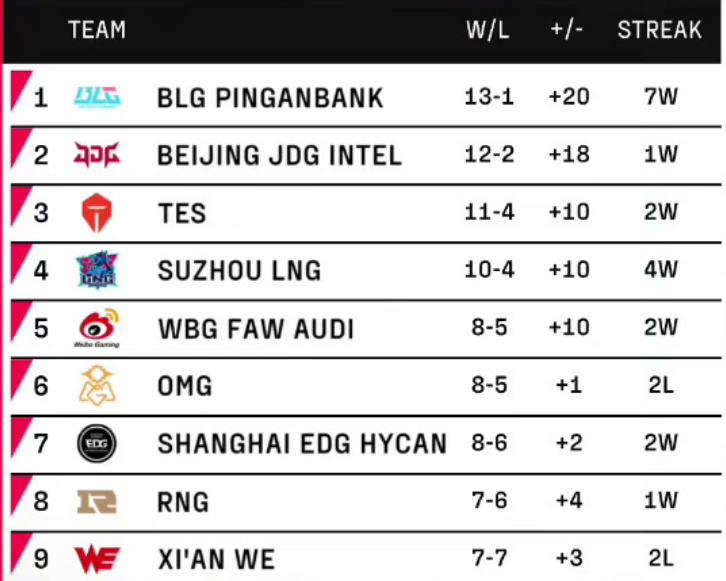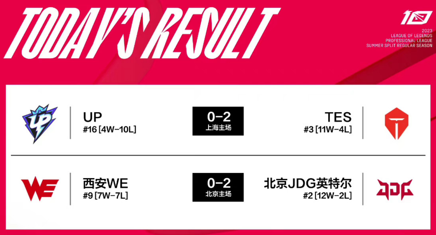 今天是7月11号,LPL常规赛进行了两场BO3对决。其中,TES和JDG,分别战胜了UP和WE,拿到了宝贵的一分。WE因为0:2不敌JDG,一局小局都赢不了,名次有所下降。如果WE常规赛,后续比赛都输了的话,理论上,有可能排在常规赛第十名。