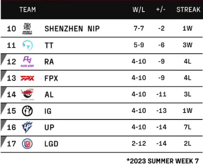 TT目前位列第十一名,仍有理论上晋级季后赛的可能。很遗憾,比TT名次还低的队伍,这个夏季赛常规赛打完后。下次要再登场,大概率是要在明年的春季赛了,希望在今年的转会期期间,这些LPL中下游的队伍可以来个大大的补强。对于NIP战队来说,目前仍有理论上排名上升的可能。只要后续的两场BO3,NIP拿下任何一场都确定晋级季后赛。