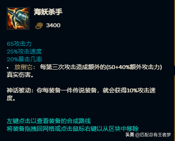 装备的话,我们可以选择不朽盾功和海洋杀手,这两件装备我们都是根据对面阵容来的,如果对面坦克比较多的话,那么我们就出海妖杀手,如果刺客或者Ap较多的情况下,我们就选择出不朽盾弓,