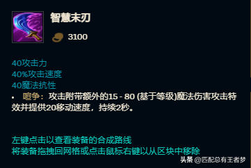 智慧末刃这件装备也非常契合剑圣的被动,能够在前期伤害不足的情况下,将伤害尽可能的提高 。