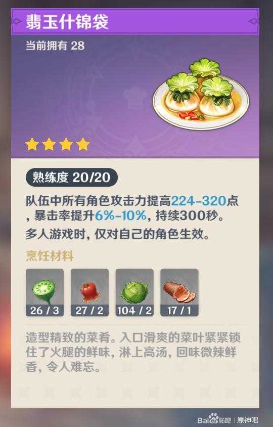 效果:完美烹饪总共加攻击力320,暴击率提升10%
