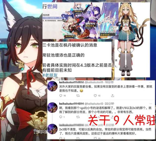 第三个原因就是再等3.7版本的新岩系弓箭角色猫娘,这个角色是已经被多位舅舅实锤了的,所以十分保真,其中也有舅舅透漏说这位角色会在3.7版本开启后正式加入到常驻池中,并且常驻池近期共有9位,也就是说还有一位枫丹角色。