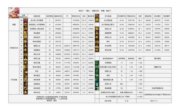结合礁石所做的数据表(原地址https://bbs.colg.cn/thread-8425907-1-1.html),帕拉丁在下个版本拥有两个八万秒伤的护石技能和数据赶超一觉的95主动。