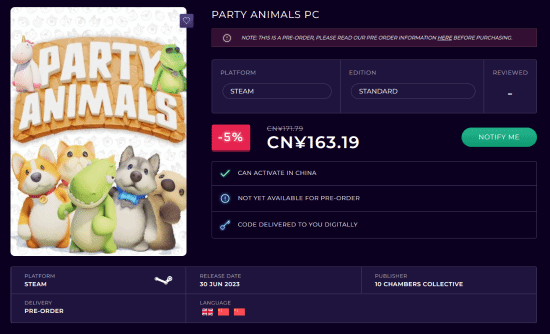 据cdkeys.com页面显示,国产派对聚会游戏《动物派对》将于6月30日发售。定价171.79元(24.59美元)。