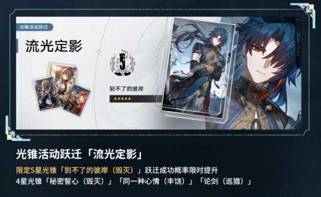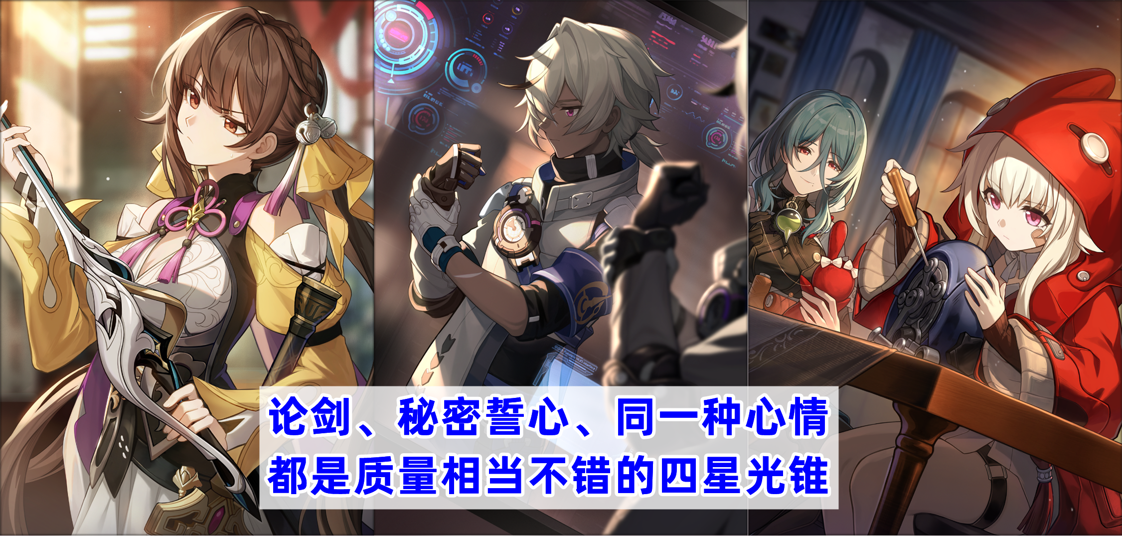 当然,如果你是为了刃抽专属光锥的话,可以等刃上线实测后,看看和其余光锥的伤害对比再做决定。个人认为,如果你抽卡资源足够的话,给刃抽专属光锥还是值得的,因为这次光锥卡池三个四星都相当不错:论剑、秘密誓心、同一种心情。