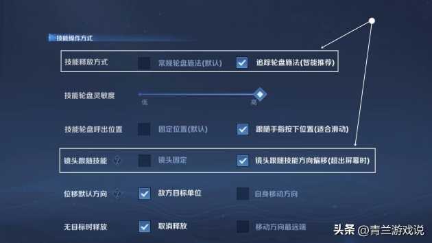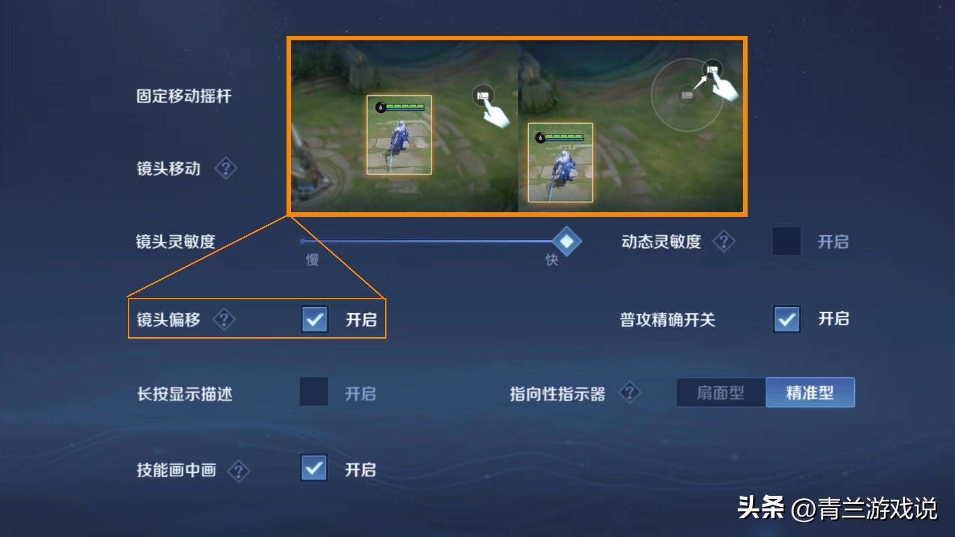小提示:如果不习惯“镜头偏移”可直接点开“镜头跟随技能方向偏移”,这样才攻击左下方向的目标或者技能释放超出屏幕时,拉动技能指示器,镜头会自动跟随。