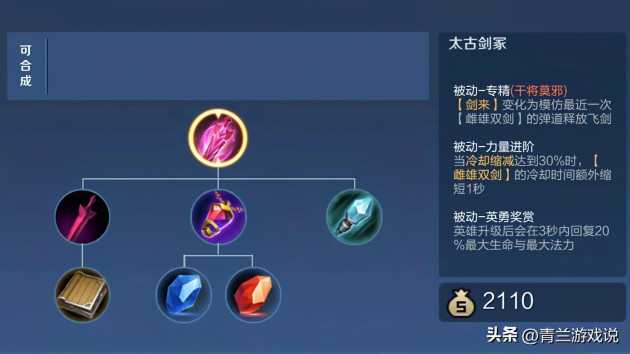 小提示:符合于干将莫邪专精装备的打法有很多,如果放弃爆发,可在开局后直接叠30%冷却缩减,即选择冷静之靴后接圣杯,然后接“太古剑冢”,后续再跟输出装填补伤害效果。此目的便是“以量变引质变”。