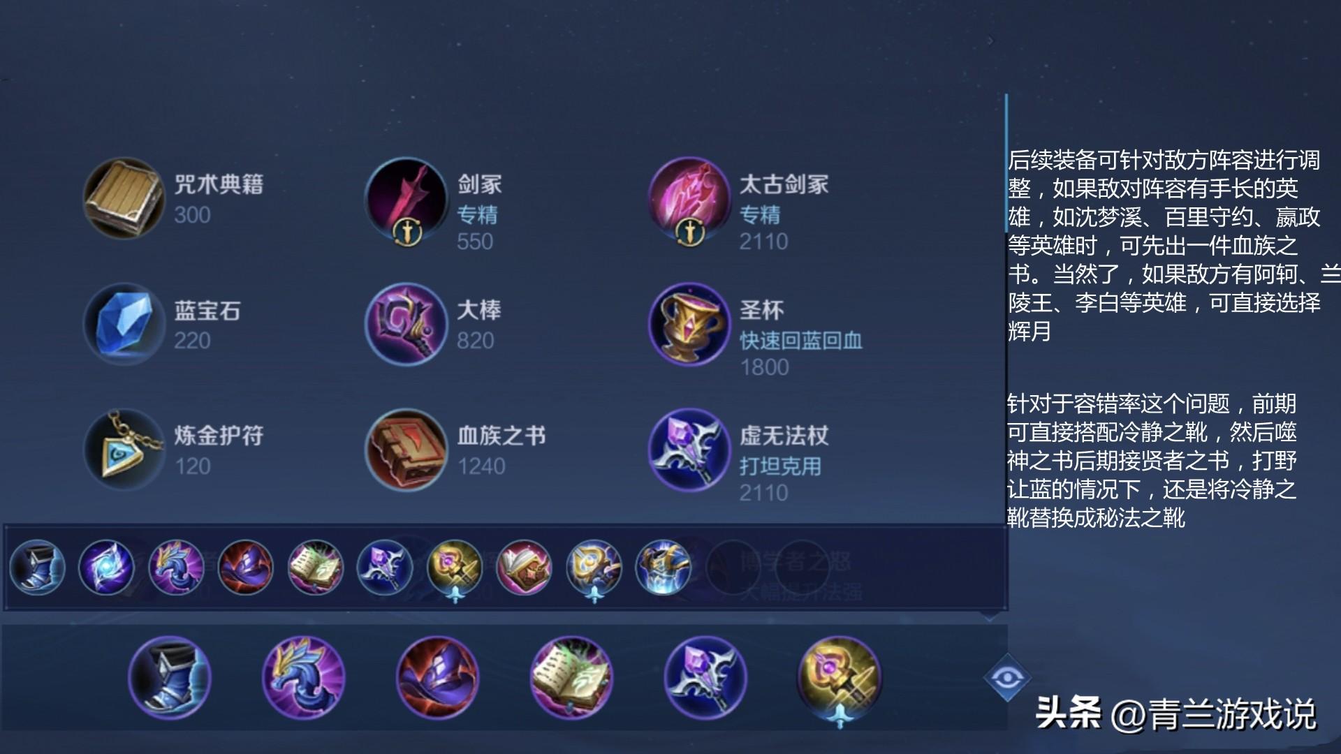 小提示:针对于容错率这个问题,前期可直接搭配冷静之靴,然后噬神之书后期接贤者之书,打野让蓝的情况下,还是将冷静之靴替换成秘法之靴。
