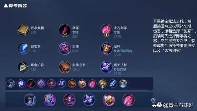 后续可先选择博学者之怒,然后接贤者之书,装备成型后再补齐虚无法杖以及“太古剑冢”。