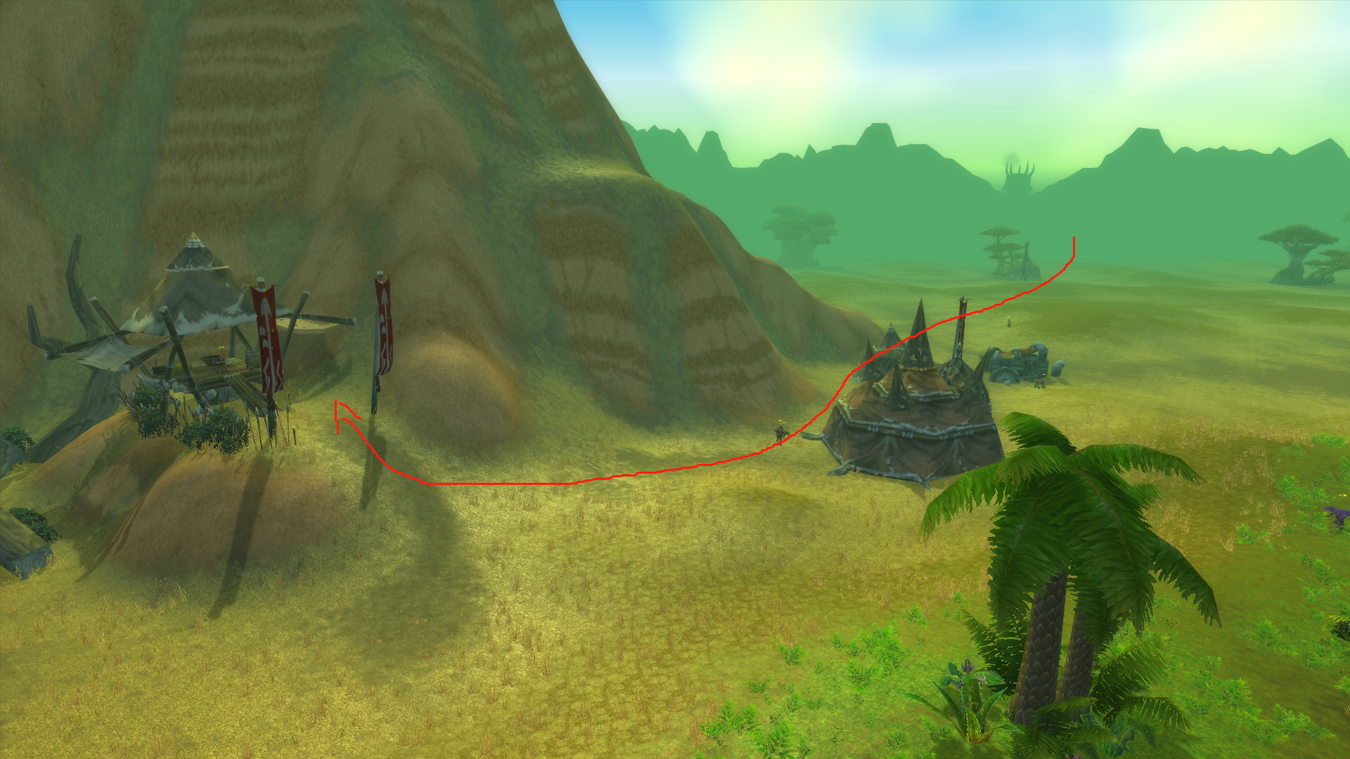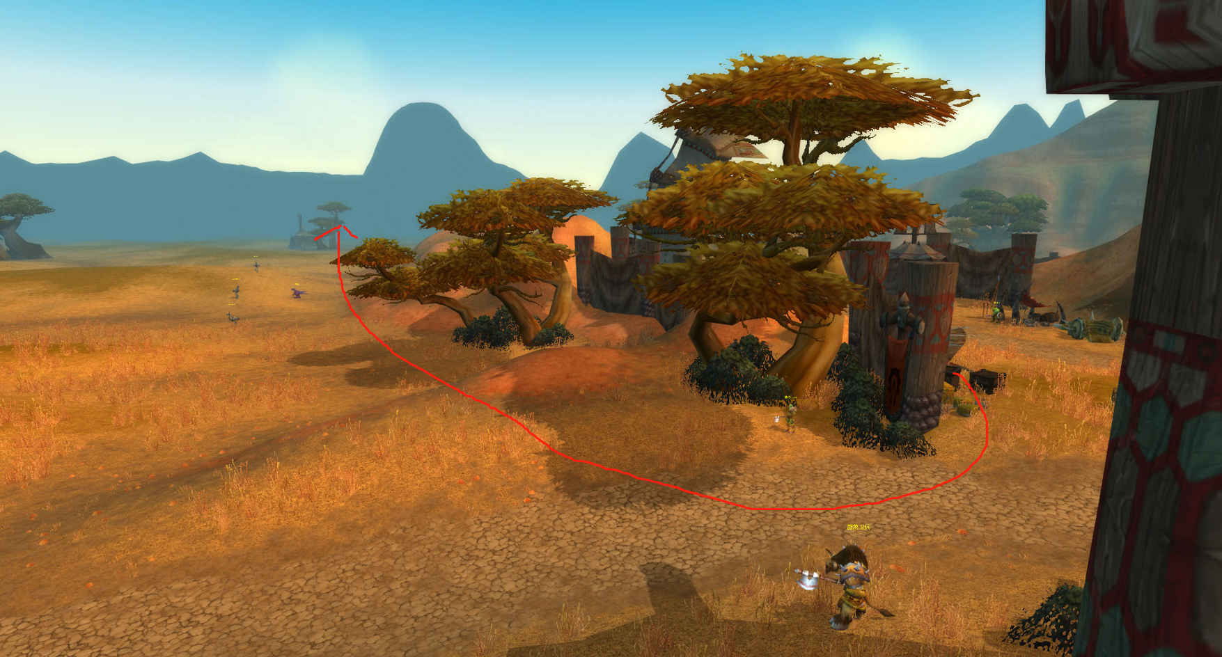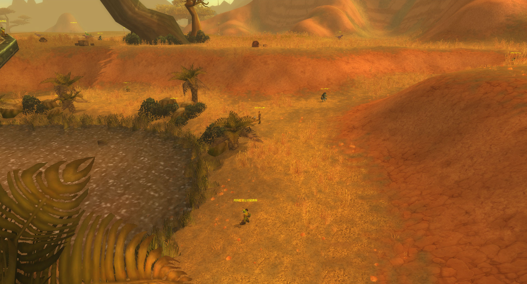 飞机到奥格瑞玛(纯粹就为了学个生命分流,少按两下。不介意的也可以不去的。如果不学分流,可以直接出门了。)。回到十字路口后,从接斑马的威胁旁边的门出去,贴山边走。走到图3处。去打人生第二个很烦的任务。运气好,1怪刷任务怪。运气不好,1-2个小时不等。