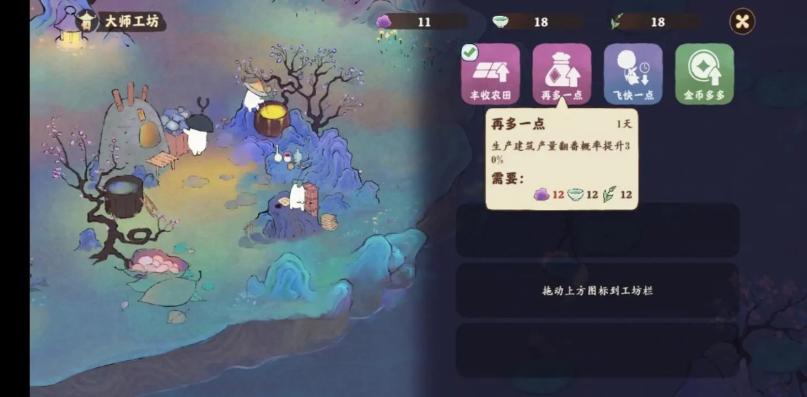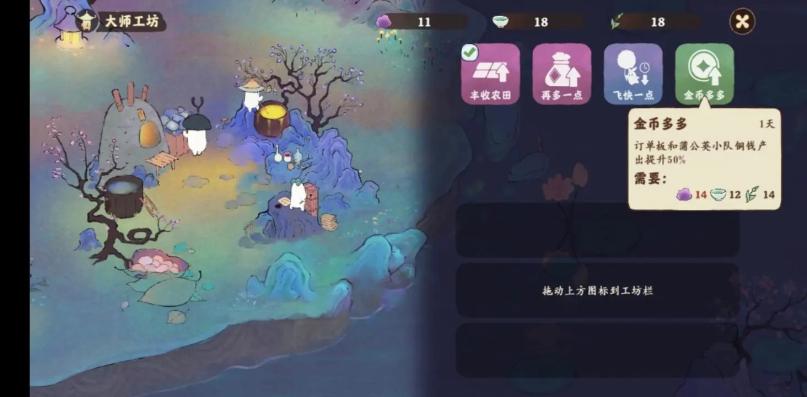 大师工坊选择再多一点提高产能,再选择金币多多提高赚钱效率。