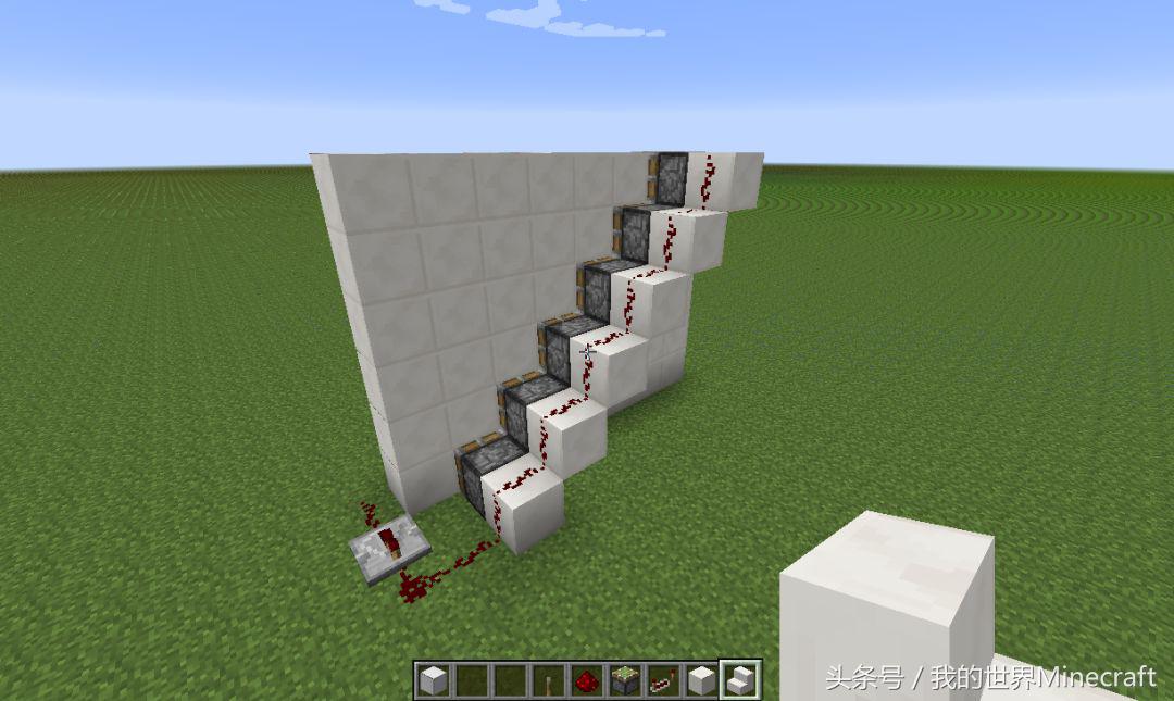 在每个“墙洞”的后面放置一个粘性活塞,这是用来牵引楼梯的,注意活塞的朝向要向着放置楼梯的一面。