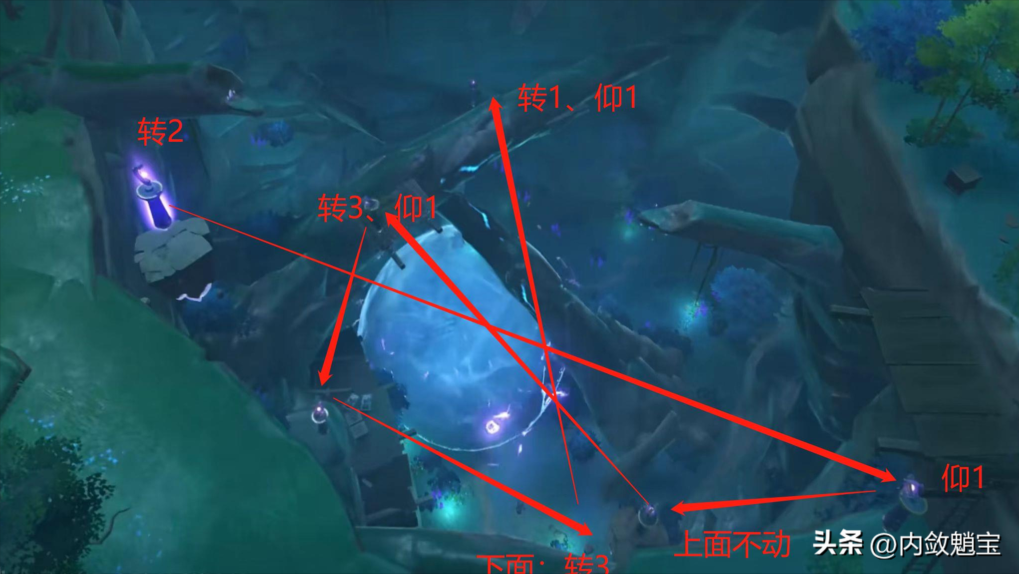 浪船锚点处为第一个:调整转向2次,第二个:2次仰角,第三个:2次转向,1次仰角。第四个(路旁边):2次转向,1次仰角,第五个,3次转向,第六个,2次转向