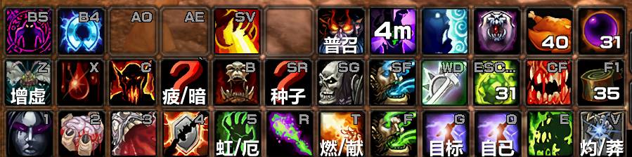 这个是全部的按键了,但一般情况下第一行技能和宠物技能我是隐藏起来的,所以技能看起来不会那么多。