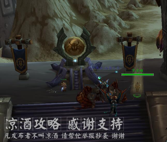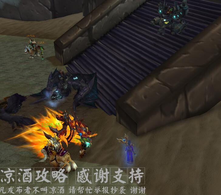 除了完成世界任务,也可以交材料来加这个分,在楼梯下边联盟和部落分别站在楼梯两侧,都是两个NPC,一个是元帅,一个是收材料的军士长,下图这个火鹰挡住了看不太清楚,隐约可见一个蓝色的问号: