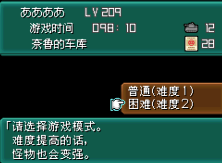此时这周目就完结了,我们准备开启二周目,去存档,然后选择重新开始,进入二周目,在二周目里面,战车数据全部都是保留的,包括装备!刚进入可以选择难度!(一周目战车装备也会继承,包括等级,开头动画也不一样!这里也可以看出,此时泰德布罗拉是无敌的)