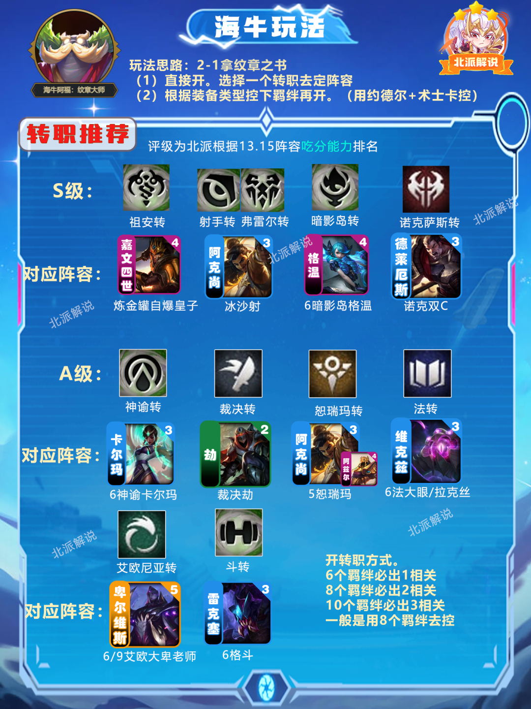 约德尔和术士是没有转职的,可以上这两个类型的卡去控相应转职。6个羁绊必出1个相关转职,8个羁绊必出2相关,10个羁绊必出3。