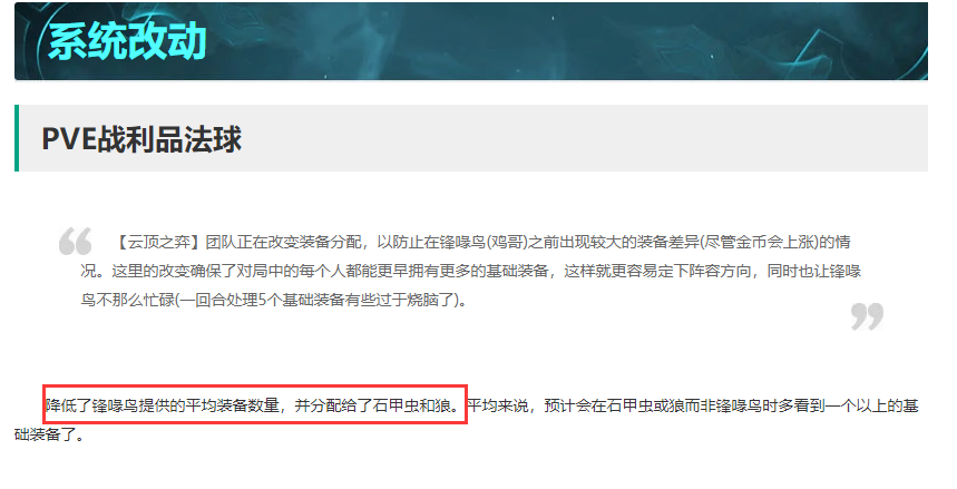 改动后可以让中低费卡阵容的主C可以更快做出2件套。搭配装备强化符文甚至可以做出3件套,而且这些阵容全部是3阶段开始发力。你想想,3阶段能D出两星诺手加三神装,闭着眼就知道他能连胜。