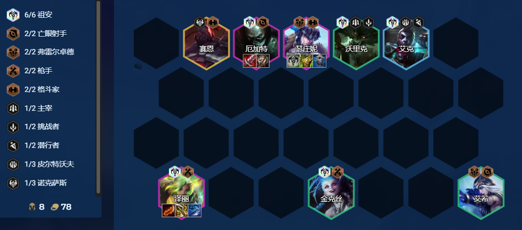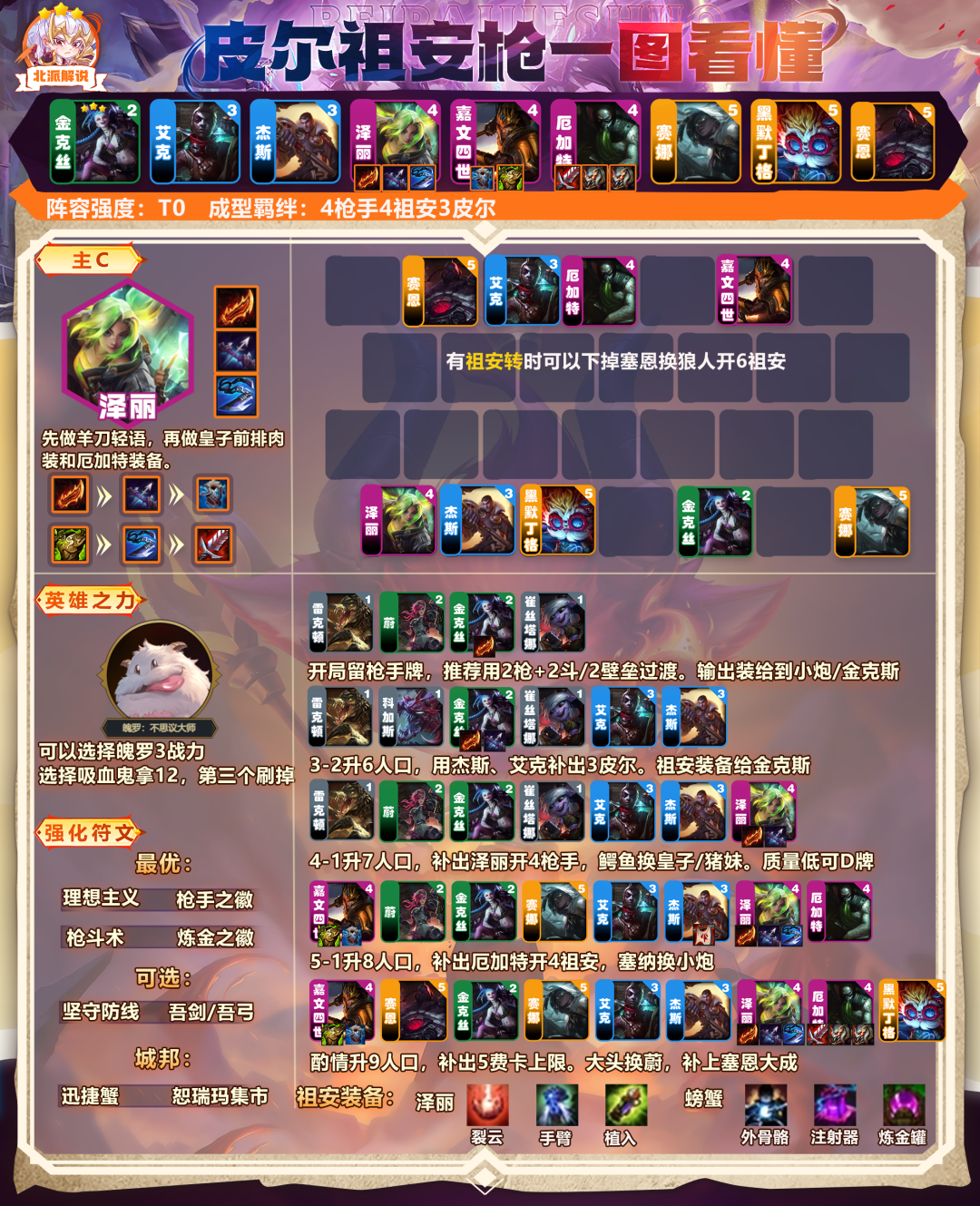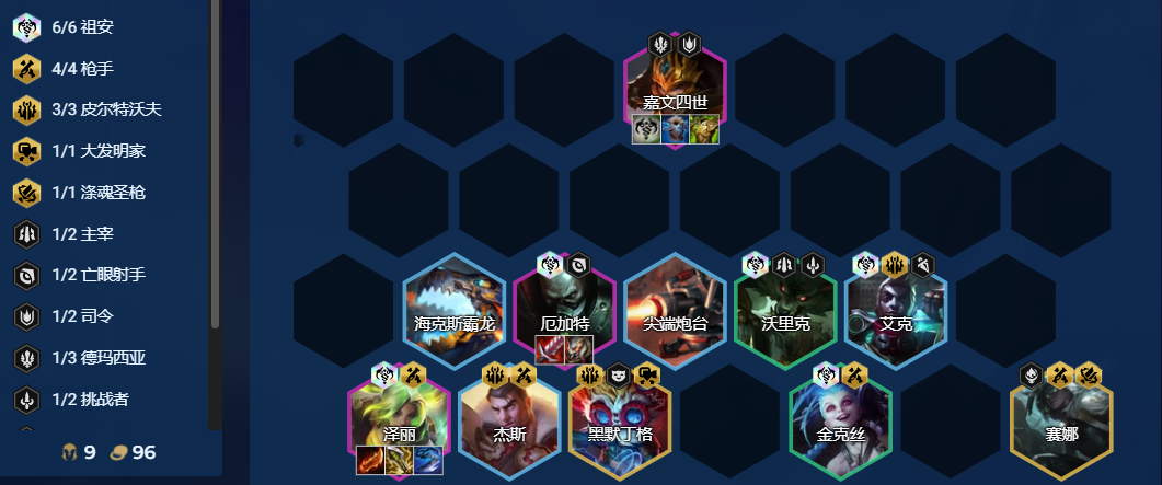 炼金罐皇子搭配:6祖安4枪手3皮尔。升不了9就不要3皮。