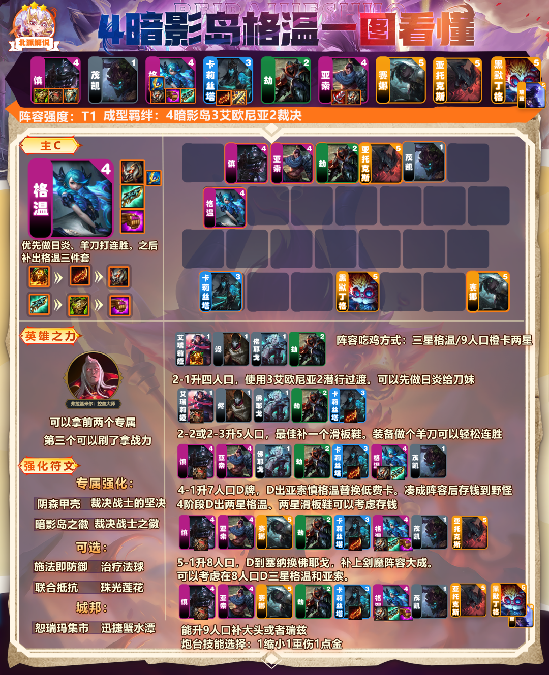 物理散件拿瑟提+烬的两星开3艾欧尼亚打过度。后面转冰枪或阿克尚。法系散件拿乌鸦开3诺克萨斯2法师打过度,后面玩法系。物理装备也可以拿乌鸦奔着诺手去玩。