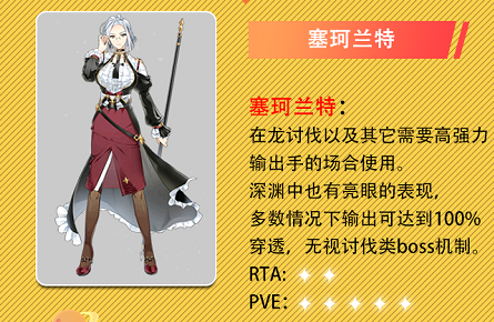 在龙讨伐以及其它需要高强力输出手的场合使用,深渊中也有亮眼的表现,多数情况下输出可达到100%穿透,无视讨伐类boss机制。